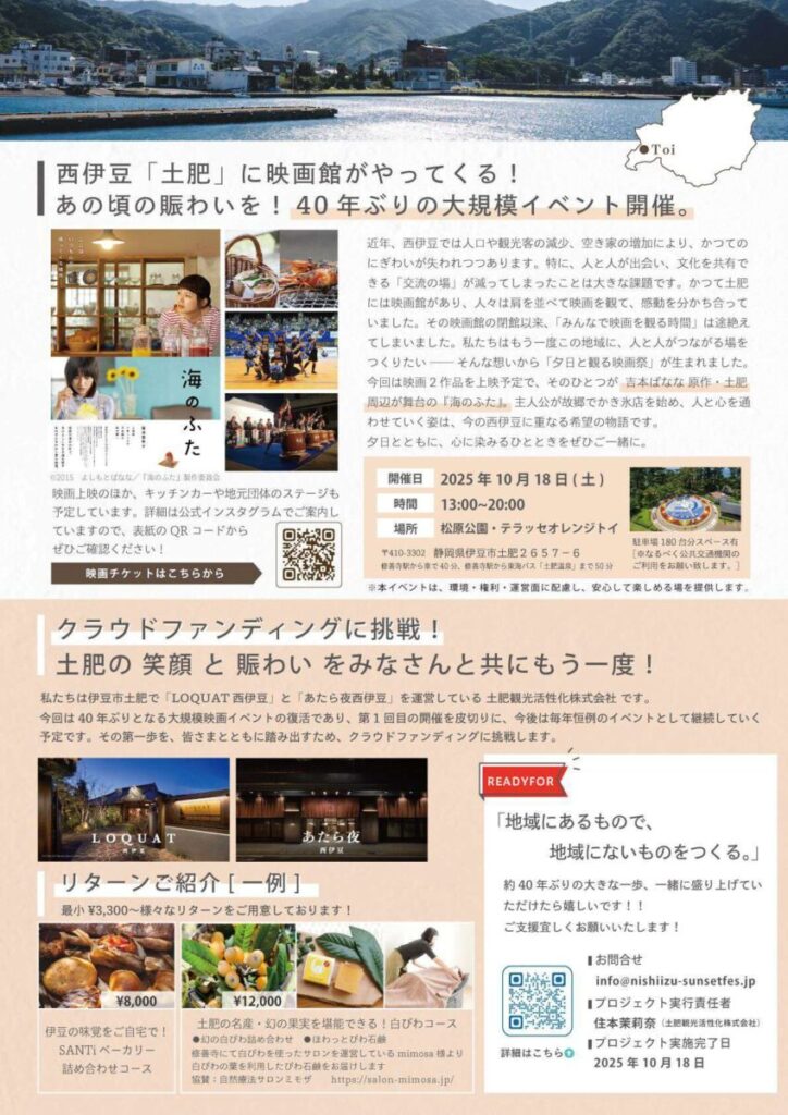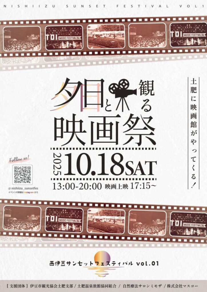 西伊豆・土肥の海辺で開催される「夕日と観る映画祭 ~西伊豆サンセットフェスティバル~」は、海・音楽・映像がひとつになった野外シネマイベントです。