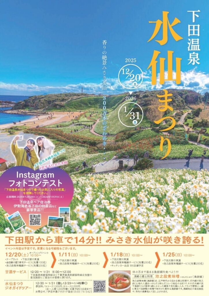 300万本の水仙が咲き誇る岬・爪木崎で、冬の海と白い花が織りなす“冬の春風景”。散策、郷土料理、甘酒サービス、地元太鼓など、自然と文化と食を楽しむ伊豆の定番イベントです。