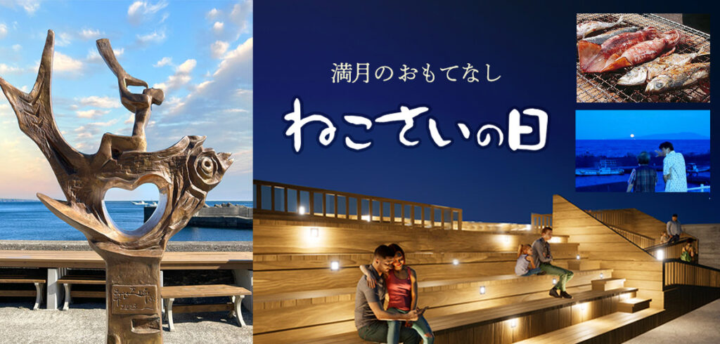 北川漁港の“ねこさい広場”で行われるこのイベントは、地元住民と観光客が一緒に満月を眺めながら海の恵みを味わう、温かい地域行事として親しまれています。